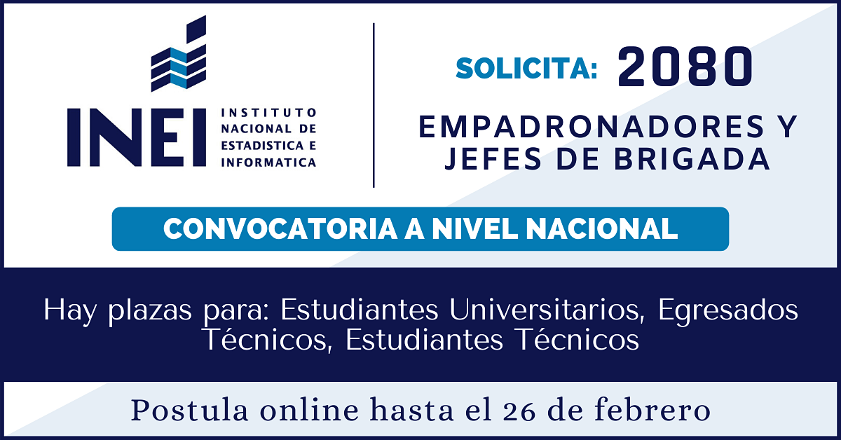 Formación académica: Egresado técnico o estudiante universitario de la carrera de administración, contabilidad, economía, estadística, estadística e informática, computación e informática, comunicación, educación, geografía, ingeniería agrónoma, ingeniería ambiental, ingeniería de sistemas, ingeniería económica, ingeniería electrónica, ingeniería de industrias alimentarias, ingeniería estadística, ingeniería geográfica, ingeniería industrial, ingeniería pesquera, investigación operativa, psicología, relaciones industriales, sociología, trabajo social u otras carreras.